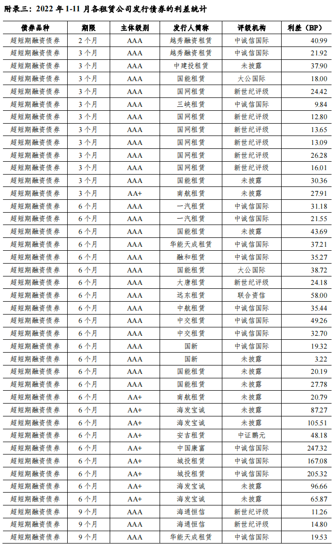 2022年1-11月发行的非结构化产品中,租赁公司发行的270天超短融、180天超短融、90天超短融、60天超短融、30天超短融、一般短期融资券、一般中期票据、一般公司债、私募债、其它金融机构债和定向工具共244支,剔除增信和无评级债券,剩余227支。在期限和主体信用等级相同的情况下,融资租赁公司债券发行利率的均值较上年同期有下降趋势,利差亦呈收窄态势。新发行债券中,9个月AA+主体评级债券发行利率和利差的差异均最大,1年期AA+主体评级债券发行利率和利差的差异次之。